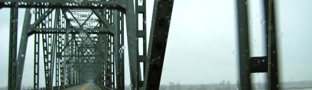 I’d like to type while we’re driving, but it makes me carsick, so I just sit in the passenger seat, watching raindrops dance on the windshield, thinking up sentences that never make it to a page. The radio is tuned to a folk station. Beneath us the grey-black asphalt rumbles as we speed through little towns with little populations. Towns like Dale, Indiana, where I filled my belly with pancakes at Windell’s, which is closing on Sunday after serving families and church groups and Kiwanis Clubs since 1947. The cab of the RV is soothing with the heat on full-blast and the slap of the wipers setting a beat for harmonies between the radio and the hum of the pavement. I’m drowsy. Alongside the road, the Ohio River strains at its banks like a fat belly against a belt.
